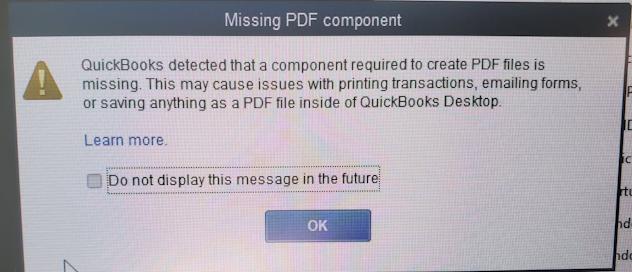Quickbooks detected that a component required to create PDF files is missing. This may cause issues with printing transactions, emailing forms, or saving anything as a PDF file inside of QuickBooks Desktop.