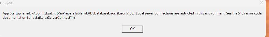 GuideComputer SoftwareDrugPakDrugpak: App Startup failed: \AppInit\EsaErr: (\SaPrepareTable()\EADSDatabaseError: (Error 5185: Local server connections are restricted in this environment. See the 5185 error code documentation for details. axServerConnect))))Updated March 06 2026